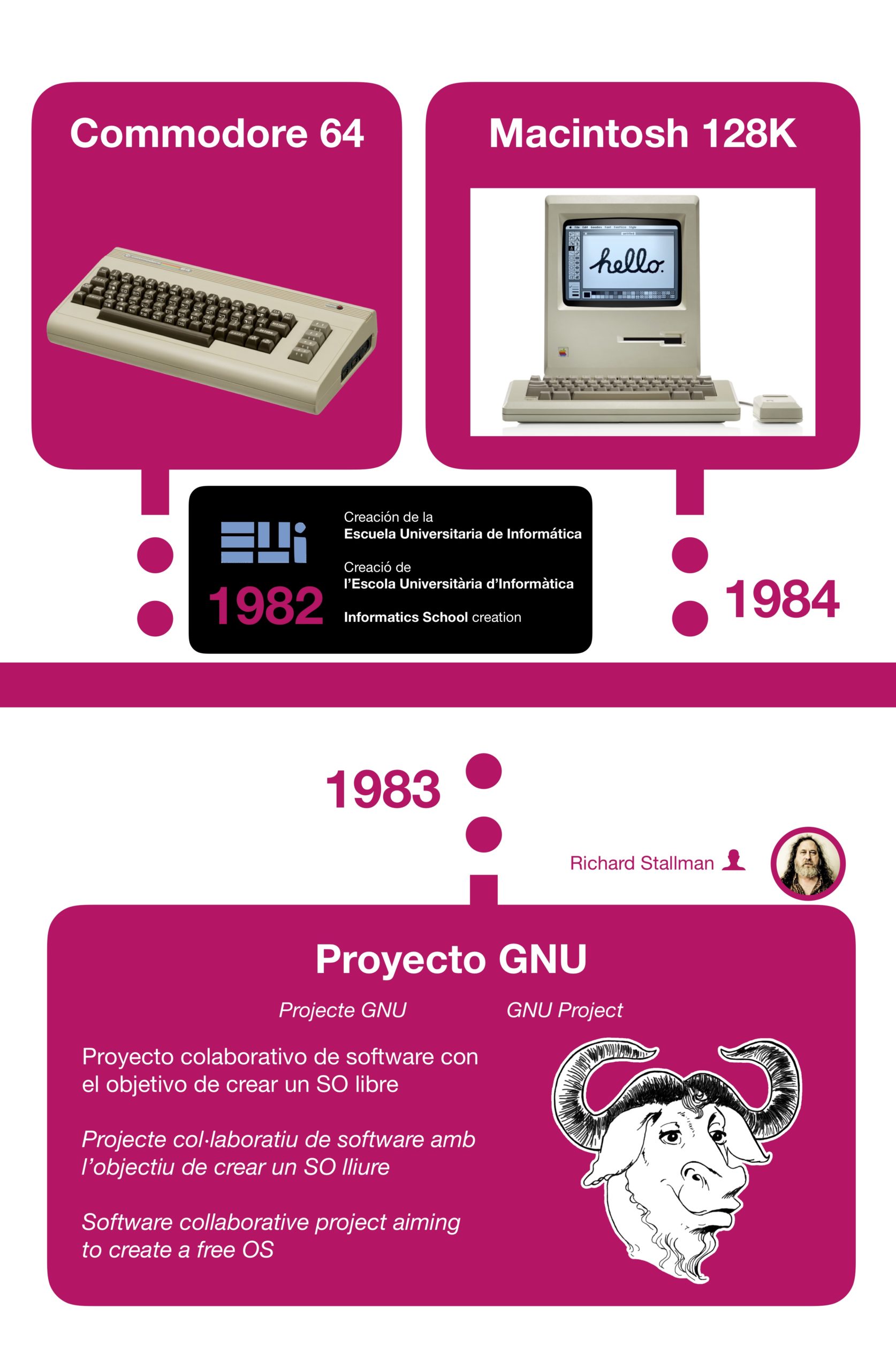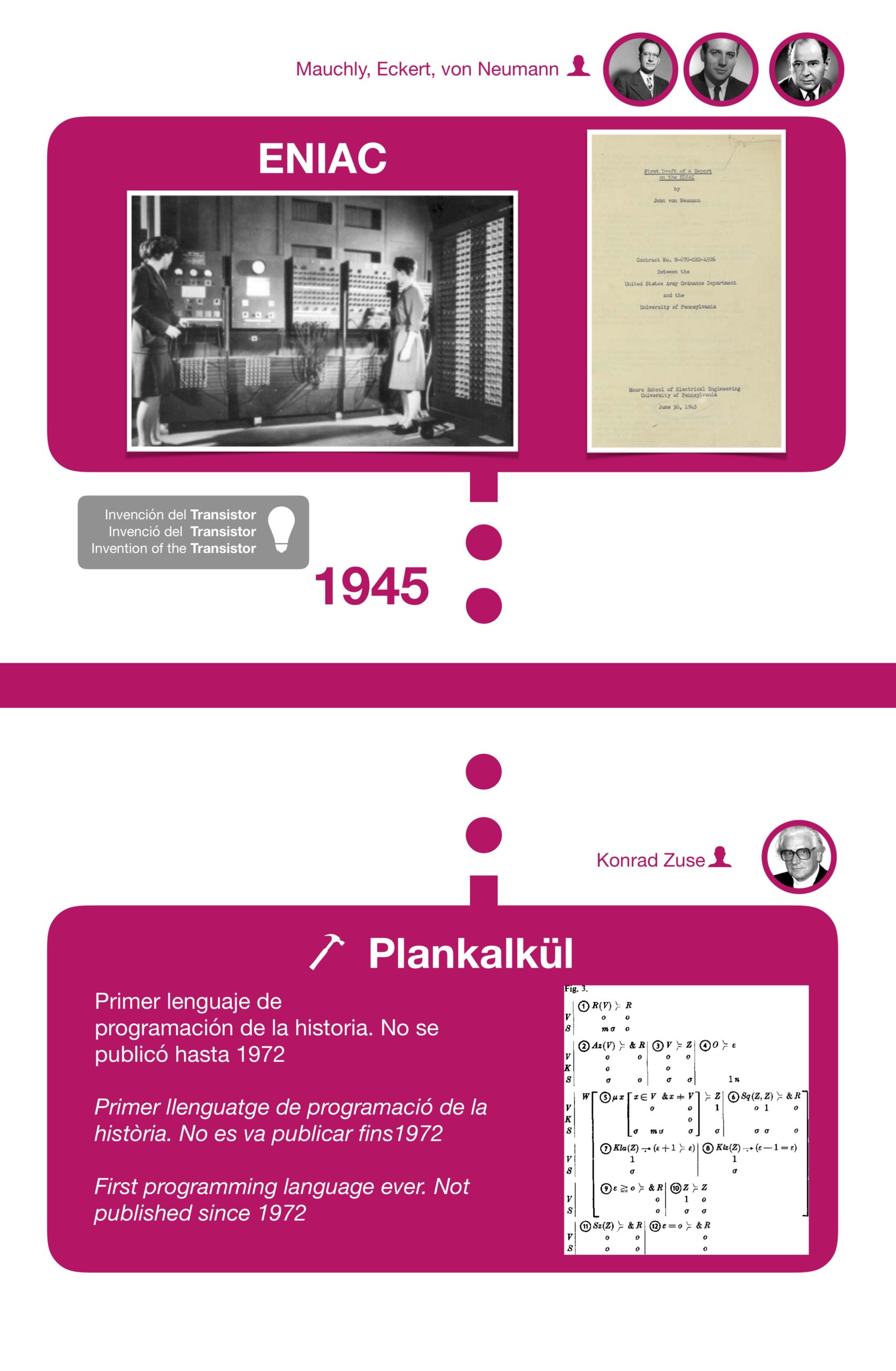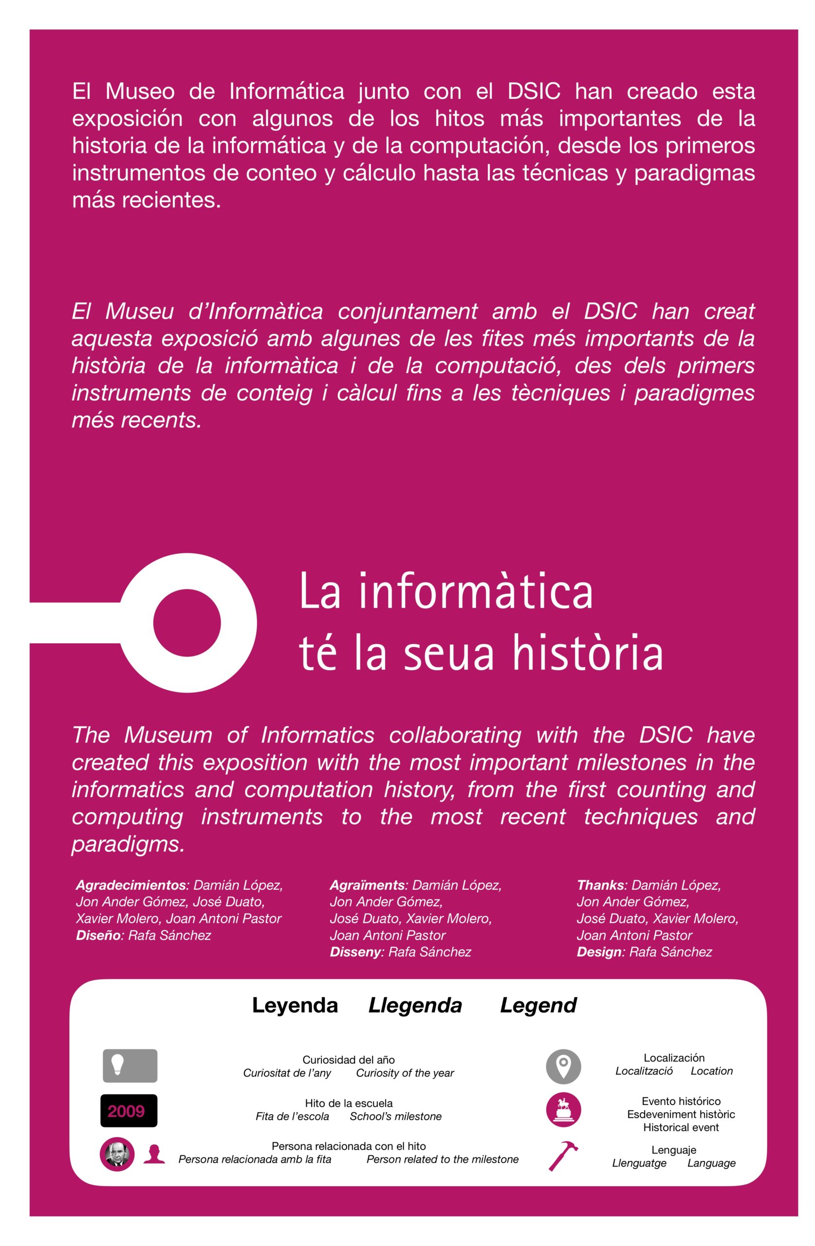 El Museu d’Informàtica de la Escola Técnica Superior d’Enginyeria Informàtica en colaboración con el Departamento de Sistemas Informáticos y Computación han plasmado los hitos más importantes de la historia de la informática en una infografía que se encuentra expuesta de manera permanente en el pasillo de los laboratorios docentes del DSIC en el edificio 1B. Como siempre, puedes consultar la exposición online aquí.